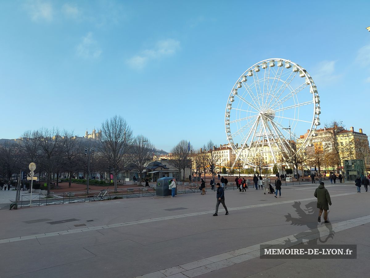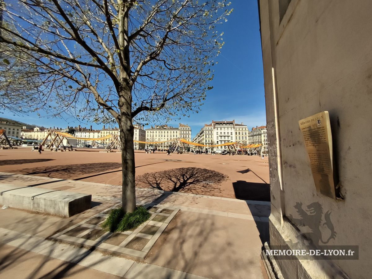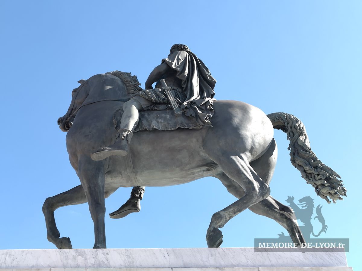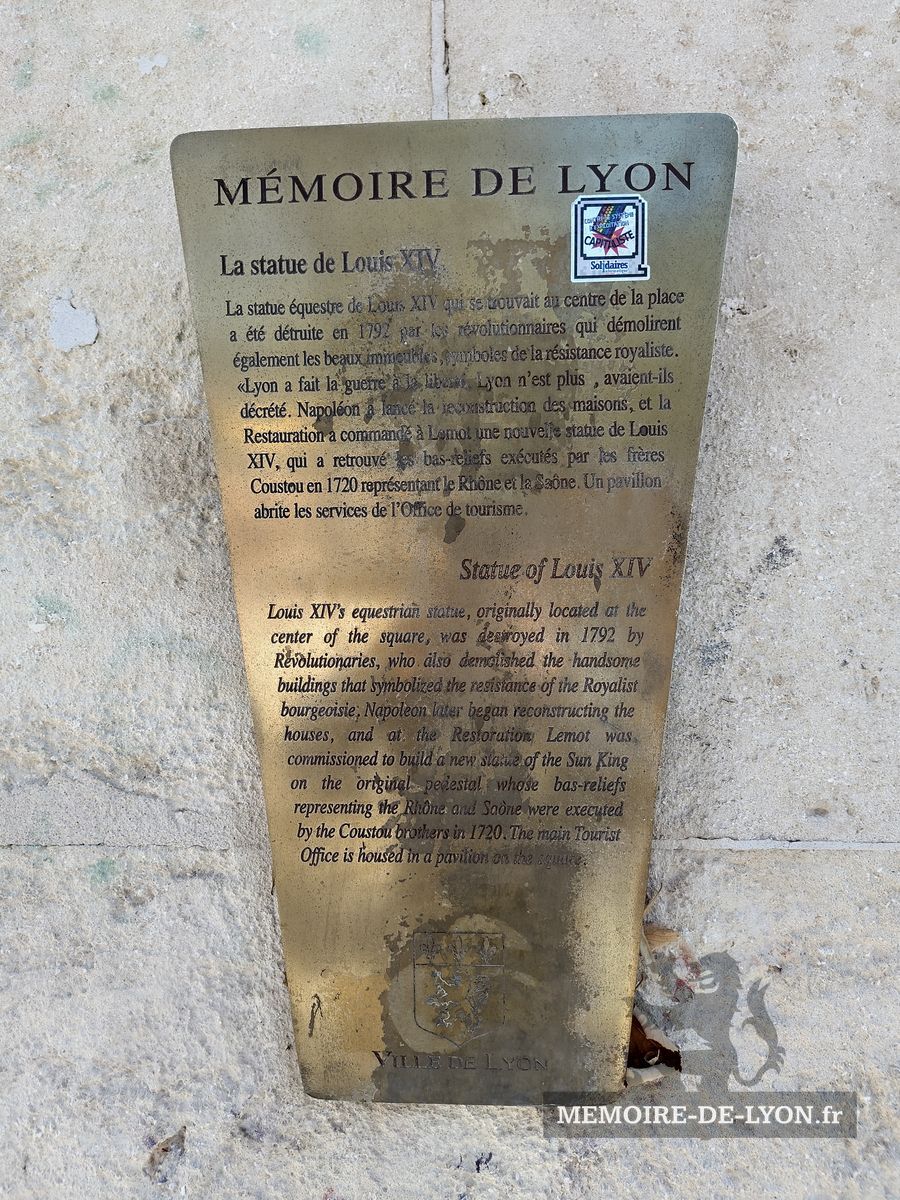 La statue équestre de Louis XVI qui se trouvait au centre de la place a été détruite en 1792 par les révolutionnaires qui démolirent également les beaux immeubles, symboles de la résistance royaliste. « Lyon a fait la guerre à la liberté, Lyon n’est plus », avaient-ils décrété. Napoléon a lancé la reconstruction des maisons, et la Restauration a commandé à Lemot une nouvelle statue de Louis XIV, qui a retrouvé les bas-reliefs exécutés par les frères Coustou ne 1720 représentant le Rhône et la Saône. Un pavillon abrite les services de l’Office de tourisme.