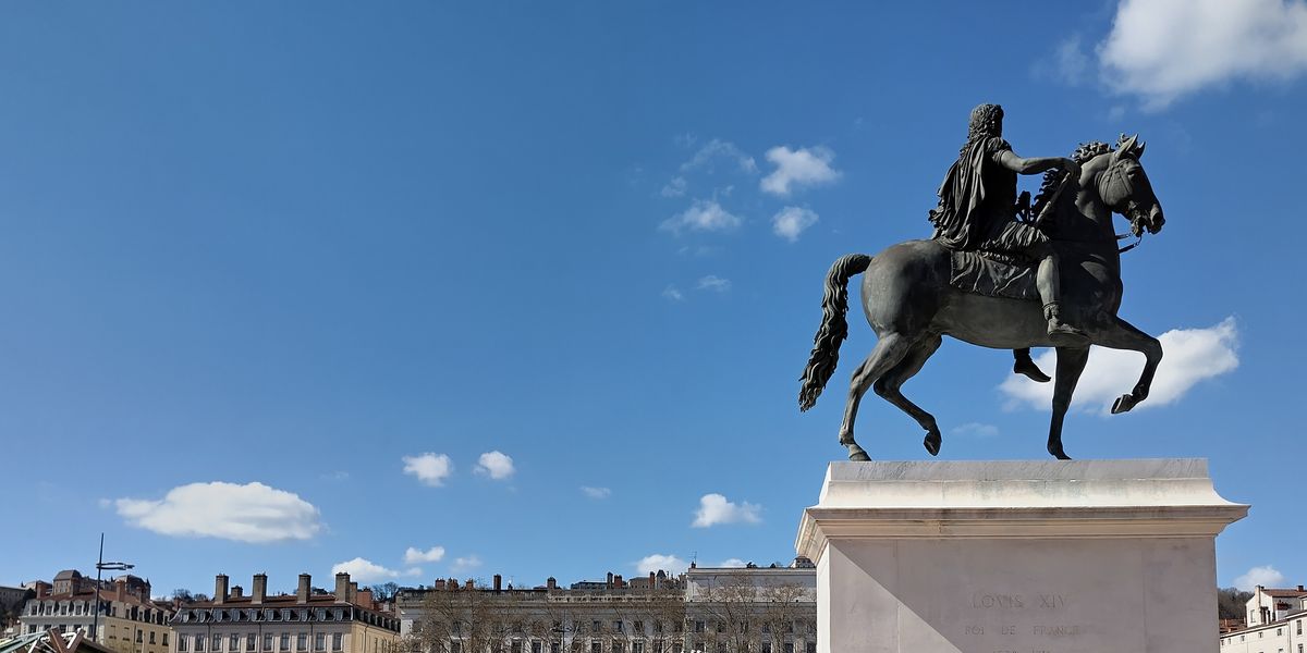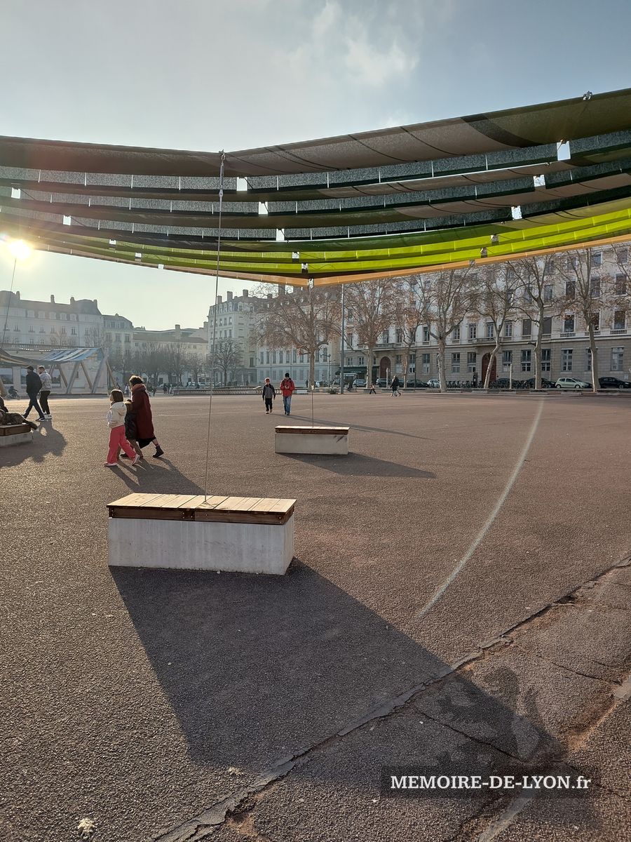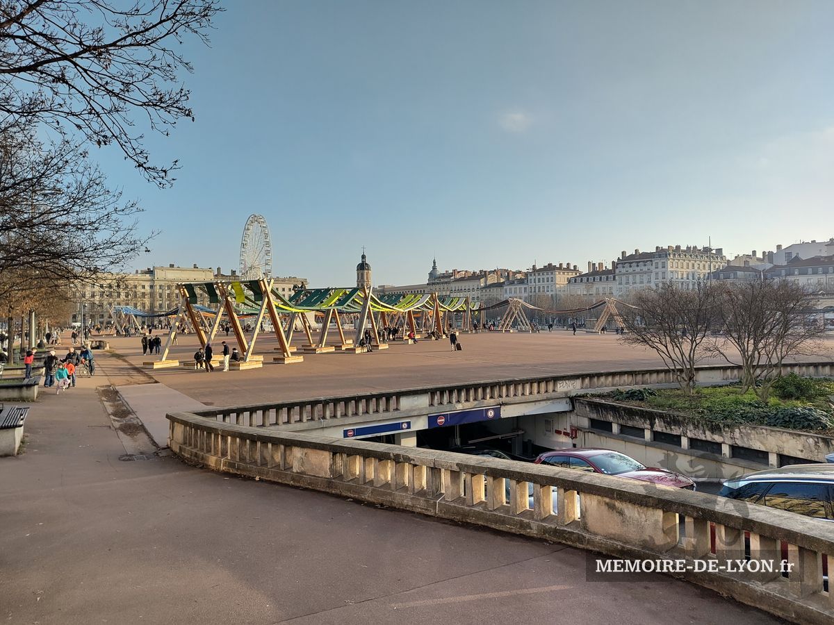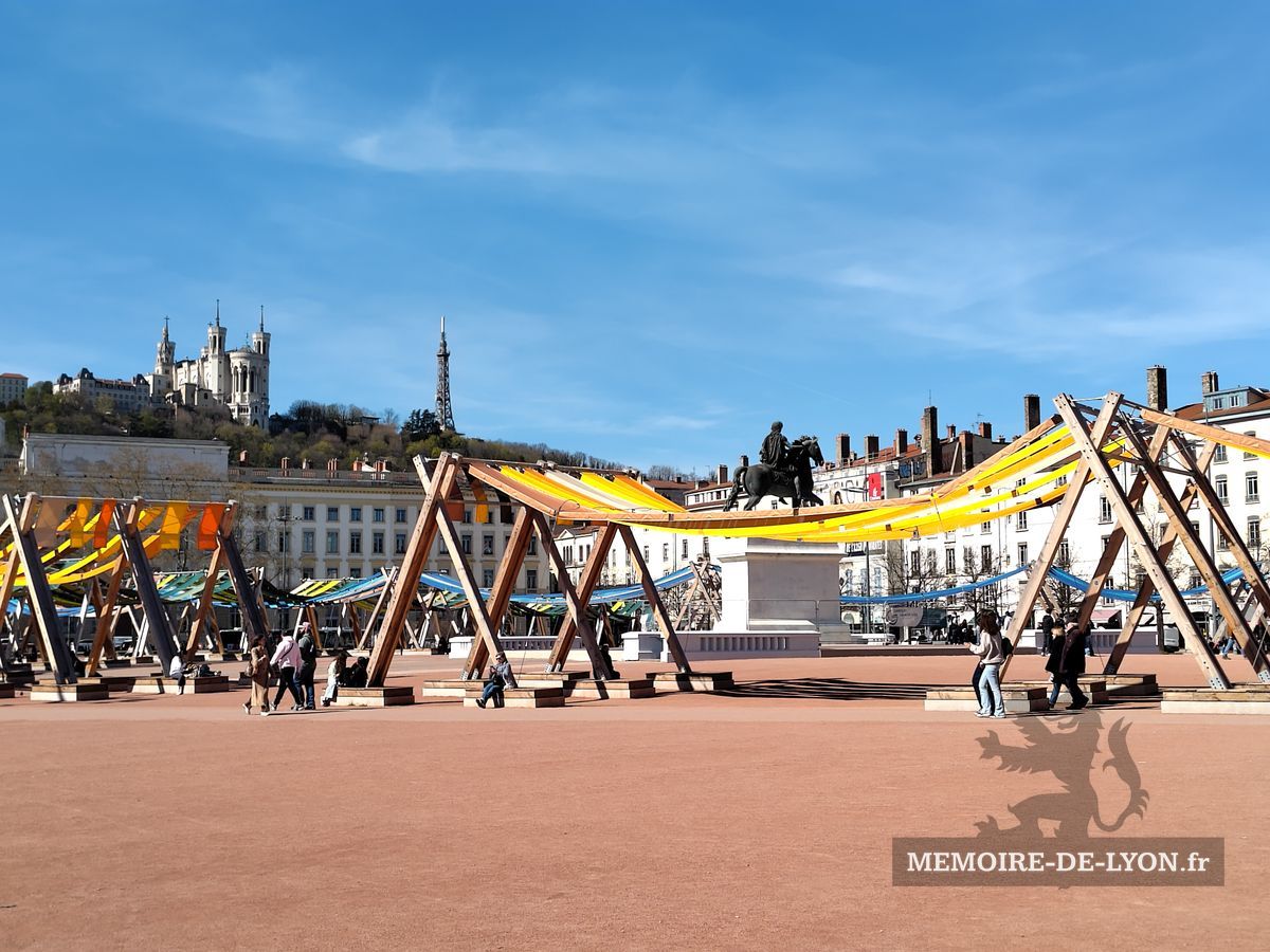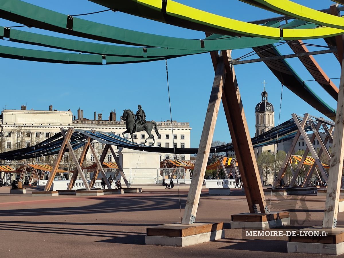 La statue équestre de Louis XVI qui se trouvait au centre de la place a été détruite en 1792 par les révolutionnaires qui démolirent également les beaux immeubles, symboles de la résistance royaliste. « Lyon a fait la guerre à la liberté, Lyon n’est plus », avaient-ils décrété. Napoléon a lancé la reconstruction des maisons, et la Restauration a commandé à Lemot une nouvelle statue de Louis XIV, qui a retrouvé les bas-reliefs exécutés par les frères Coustou ne 1720 représentant le Rhône et la Saône. Un pavillon abrite les services de l’Office de tourisme.
