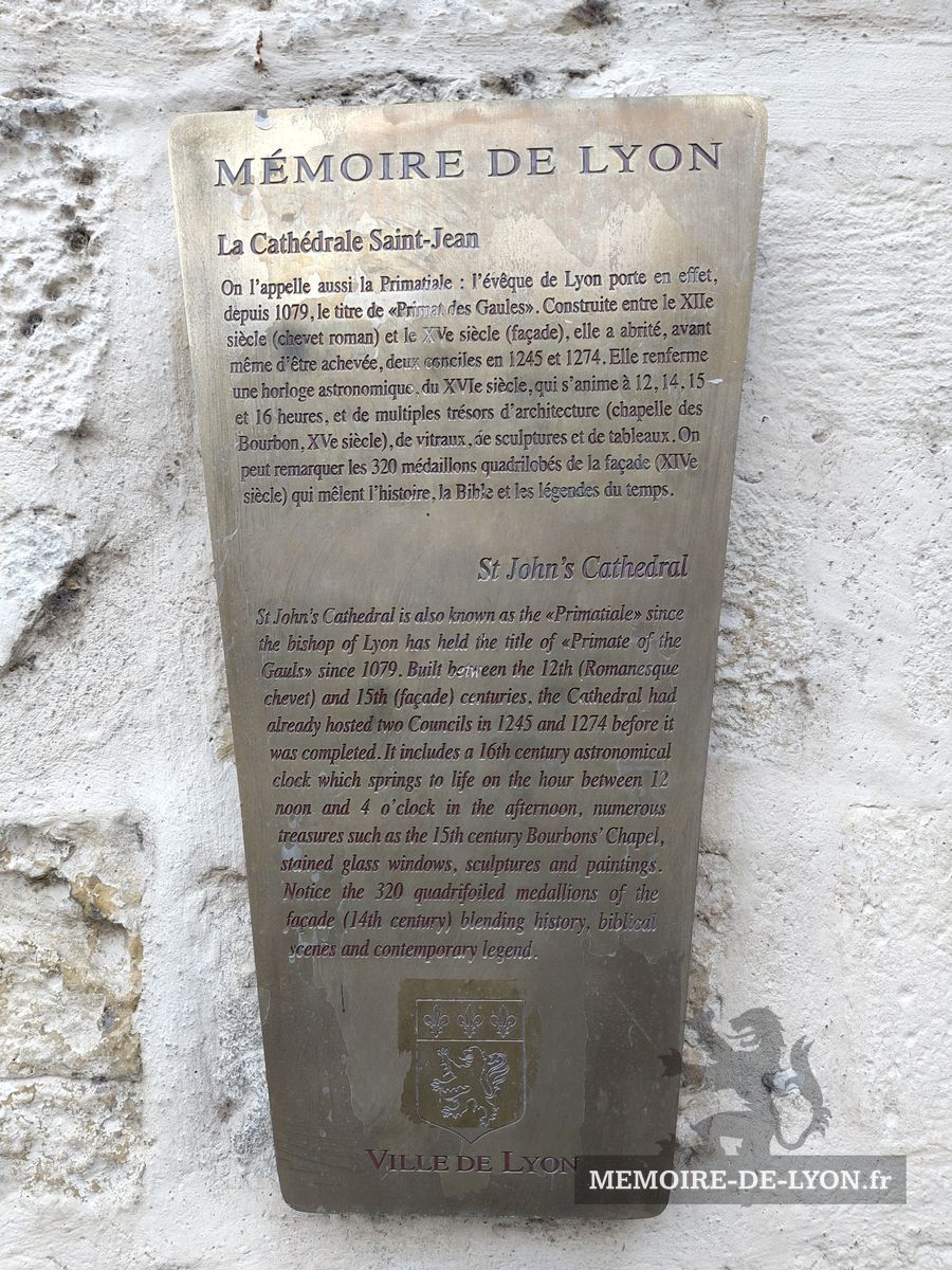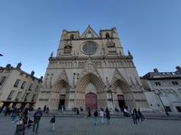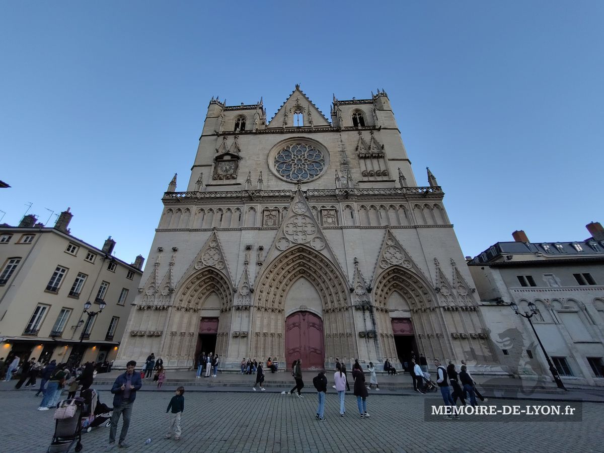 On l’appelle aussi la Primatiale : l’évêque de Lyon porte en effet, depuis 1079, le titre de « Primat des Gaules ». Construite entre le XIIe siècle (chevet roman) et le XVe siècle (façade), elle a abrité, avant même d’être achevée, deux conciles en 1245 et 1274. Elle renferme une horloge astronomique, du XVIe siècle, qui s’anime à 12, 14, 15 et 16 heures, et de multiples trésors d’architecture (chapelle des Bourbon, XVe siècle), de vitraux, de sculptures et de tableaux. On peut remarquer les 320 médaillons quadrilobés de la façade (XIVe siècle) qui mêlent l’histoire, la Bible et les légendes du temps.