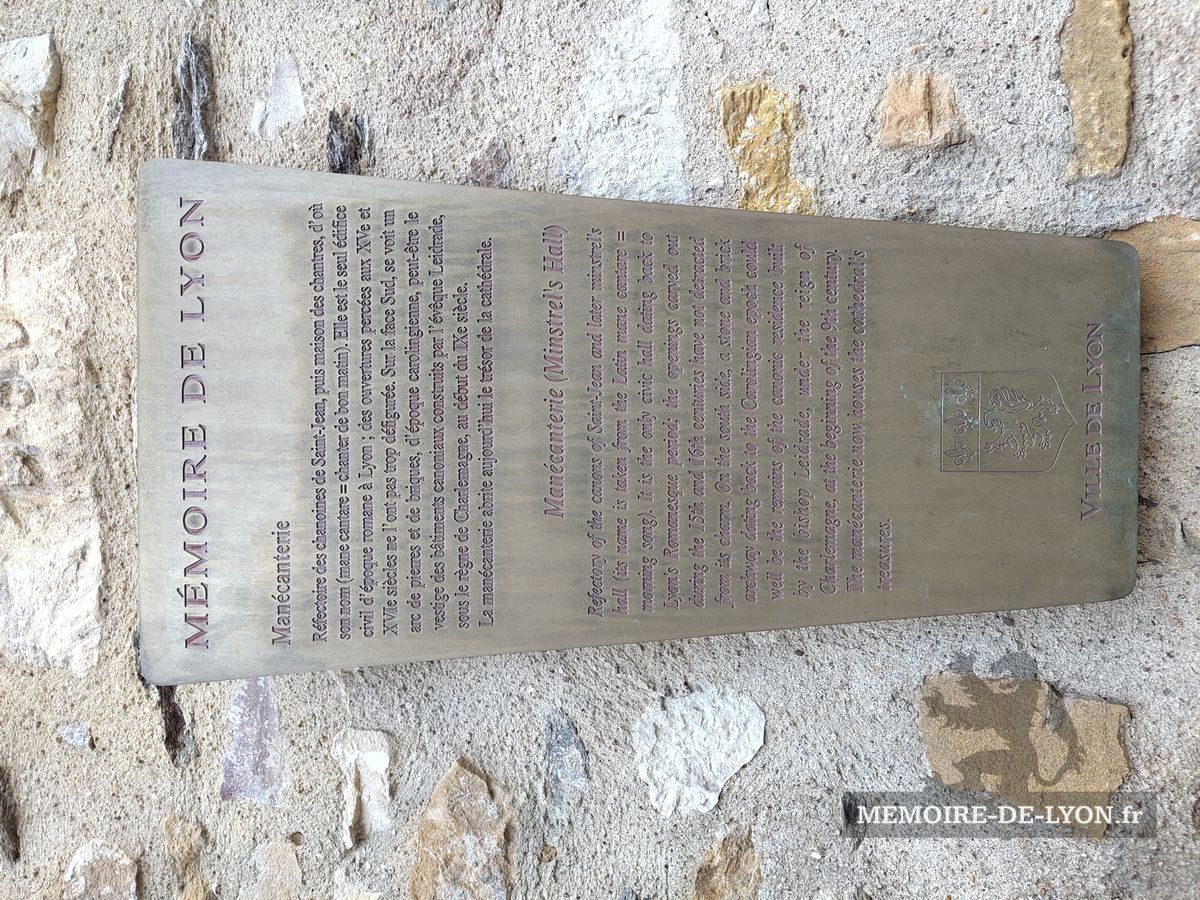 Refectory of the canons of Saint‑Jean and later minstrel's hall (its name is taken from the Latin mane cantare = morning song). It is the only civic hall dating back to Lyon's Romanesque period; the openings carved out during the 15th and 16th centuries have not detracted from its charm. On the south side, a stone and brick archway dating back to the Carolingian epoch could well be the remains of the canonic residence built by Bishop Leidrade under the reign of Charlemagne at the beginning of the 9th century. The manécanterie now houses the cathedral's treasures.