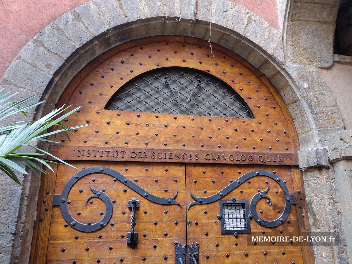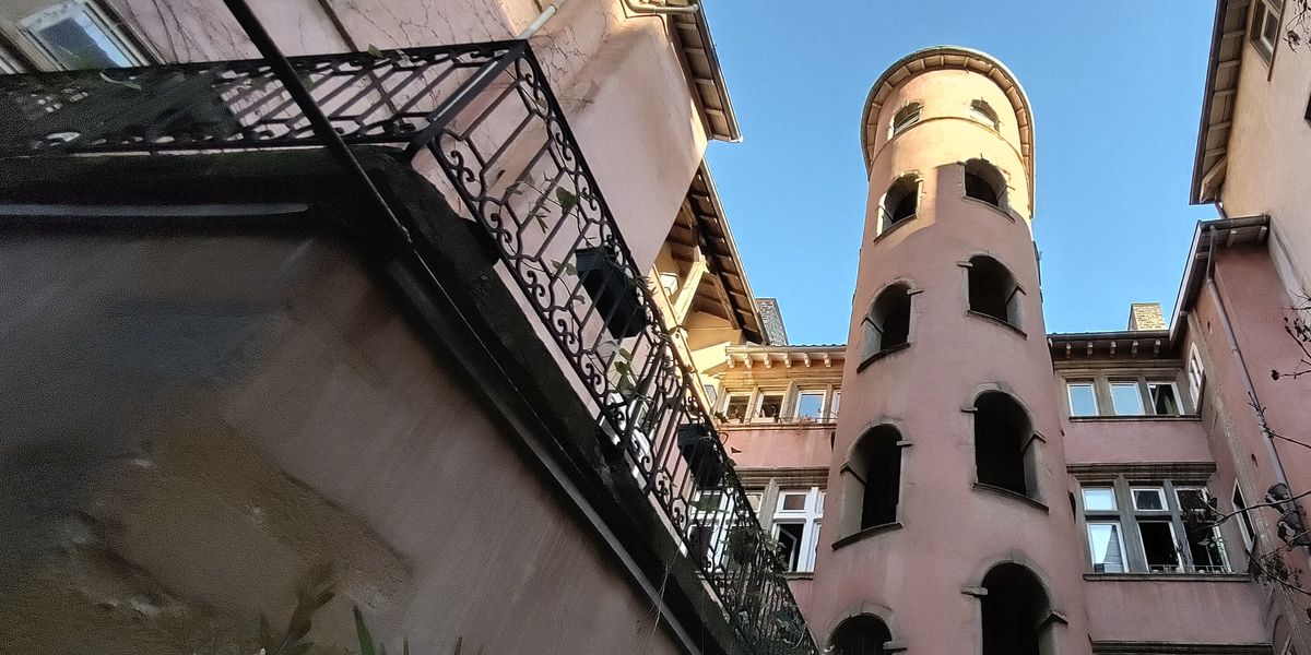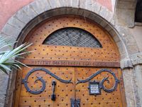 At the entrance, the bossed doorway is topped by an ornamental pediment sculpted with a scene depicting the Virgin and Child, with two people kneeling in the foreground and Saint Joseph in the background. In the courtyard, a high tower jutting out from the façade houses a spiral staircase. To the rear, hanging gardens climb the hillside.
