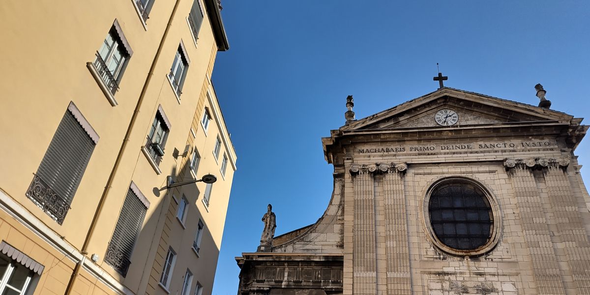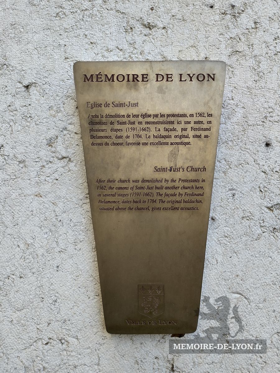 Après la démolition de leur église par les protestants, en 1562, les chanoines de Saint‑Just en reconstruisirent ici une autre, en plusieurs étapes (1591‑1662). La façade, par Ferdinand Delamonce, date de 1704. Le baldaquin original, situé au‑dessus du chœur, favorise une excellente acoustique.