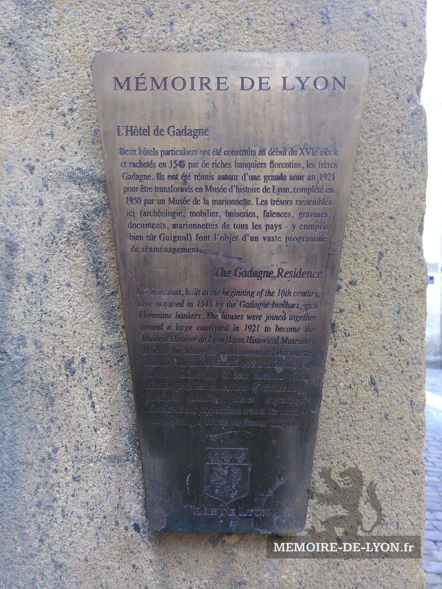 Deux hôtels particuliers ont été construits au début du XVIe siècle et rachetés en 1545 par de riches banquiers florentins, les frères Gadagne. Ils ont été réunis autour d’une grande cour en 1921 pour être transformés en Musée d’histoire de Lyon, complété en 1950 par un Musée de la marionnette. Les trésors rassemblés ici (archéologie, mobilier, boiseries, faïences, gravures, documents, marionnettes de tous les pays – y compris bien sûr Guignol) font l’objet d’un vaste programme de réaménagement.