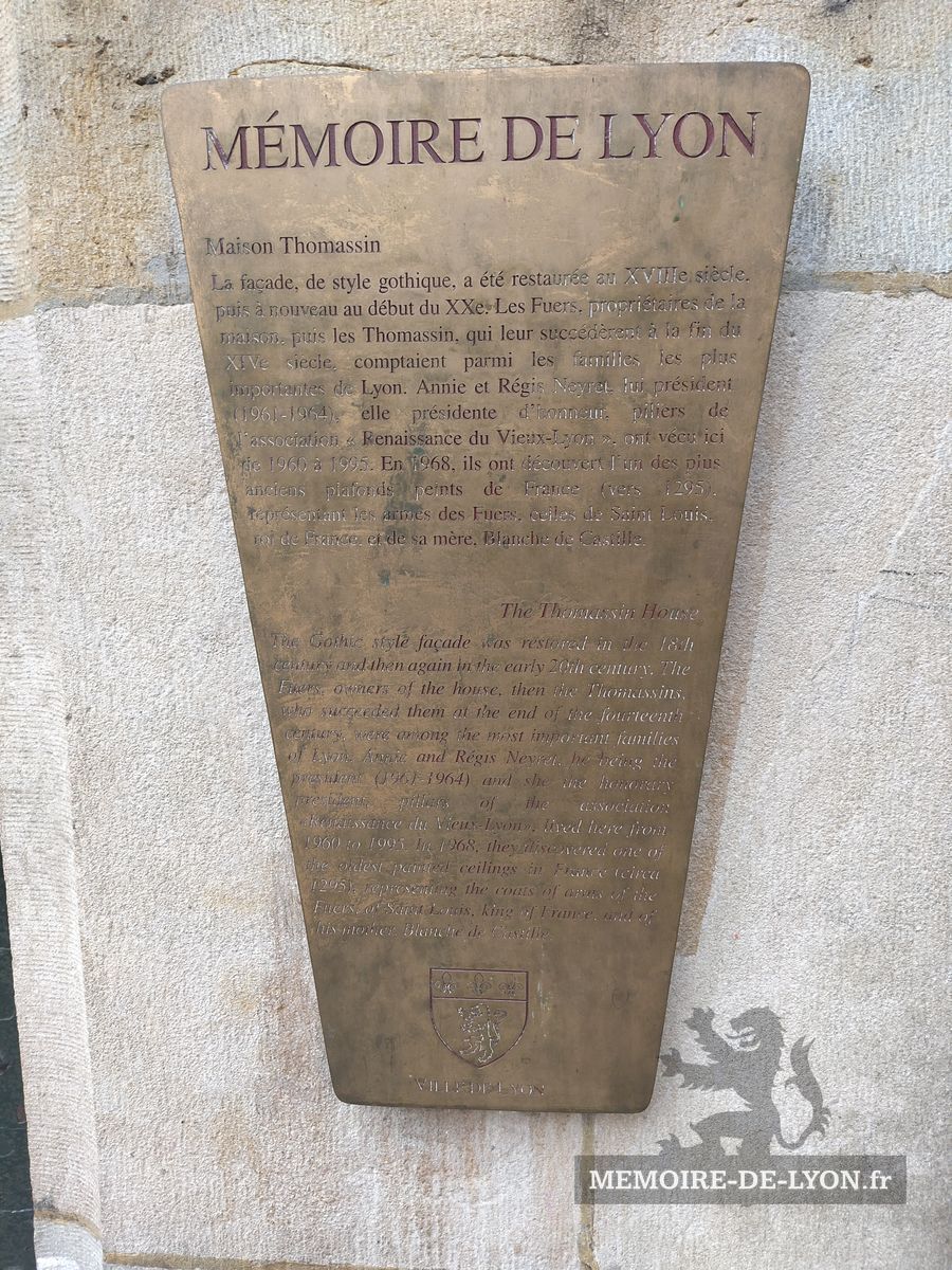 La façade, de style gothique, a été restaurée au XVIIe siècle, puis à nouveau au début du XXe siècle. La famille de Fuers, qui posséda la maison, puis celle des Thomassin, qui lui succéda à la fin du XIVe siècle, comptaient parmi les principales familles de Lyon. Dans l’immeuble sur cour, on a retrouvé sous un faux plafond, en 1968, un plafond peint aux armes des Fuers accompagnées de celles de Saint Louis et de la reine Blanche de Castille, datant des environs de 1295 : c’est l’un des plus anciens plafonds peints de France.