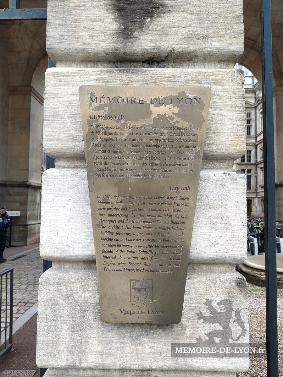 En 1646, les « consuls » de Lyon ont commandé à Simon Maupin un Hôtel de Vile digne de leur prestige. Le mathématicien Girard Desargues et le fresquiste Thomas Blanchet lui ont apporté leur collaboration. Après un incendie, l’architecte Hardouin-Mansart a restauré le bâtiment et surélevé al façade sur les Terreaux, pour faire bonne figure à côté de la façade voisine des Dames de Saint-Pierre. Une partie des décors intérieurs et des salons a été réalisée sous le Second Empire, au moment où le sénateur Vaïsse, cumulant les fonctions de préfet et de maire, habitait les lieux.